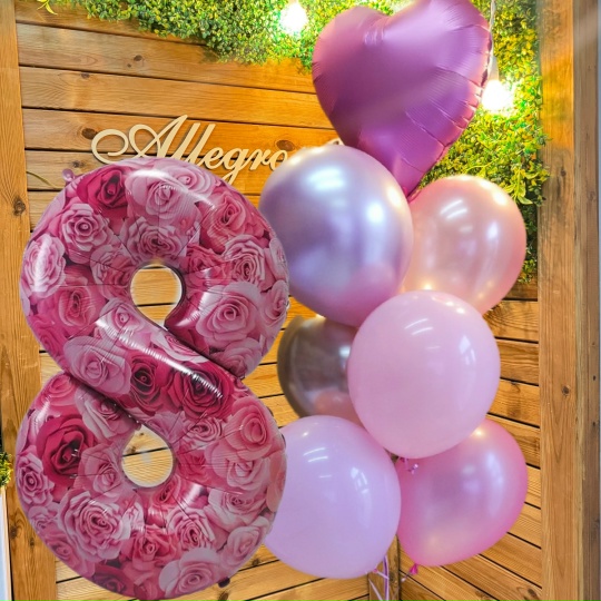 Шар цифра 8 фольга Три латексных шара фуксия Два латексных шара с конфетти С гелием Цена может меняться в связи с изменений не на гелий! Уточняйте!